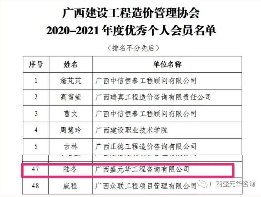 2022年7月5日,廣西建設工程造價管理協會發布《關于公布2020-2021年度先進單位會員和優秀個人會員的通知》,表彰了經過專家委員會評定、名單公示等嚴格程序最終評選出的46家“先進單位會員”及48名“優秀個人會員”。廣西盛元華再次脫穎而出,榮獲“2020-2021年度先進單位會員”榮譽稱號。同時,我公司副總經理、司法鑒定中心主任陸冬榮獲“2020-2021年度優秀個人會員”榮譽稱號。