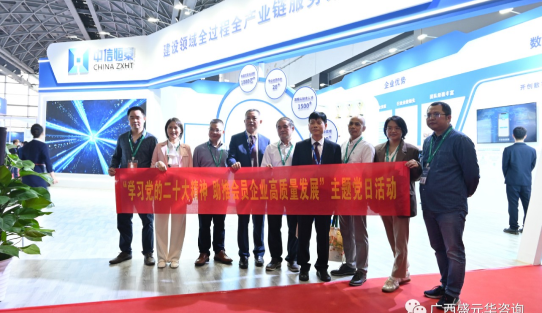 公司領導及公司黨支部成員與廣西建設工程造價協會黨支部在觀展期間進行了黨建活動交流并集體合影